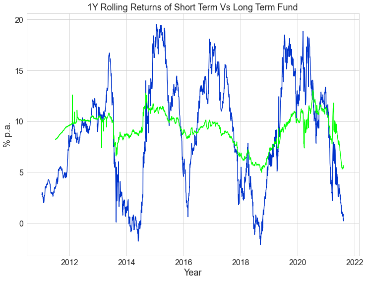 Comparison of rolling 1Y returns of a short term debt scheme and long term debt scheme shows how volatility in returns increases for longer duration funds.